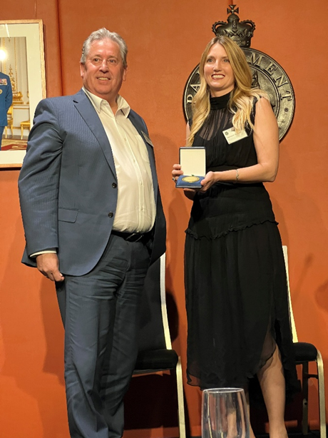 Dr. Rebecca Duncan accepting her gold medal from ANSTO CEO Shaun Jenkinson, during the annual AINSE Networking dinner 2025.